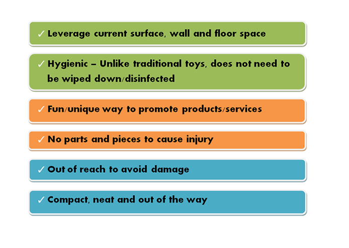 Our units are compact and powerful, delivering a number of high-value benefits including, branded games and effects to help promote your company's vision, products and services while improving your customer experience and awareness.