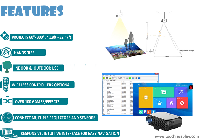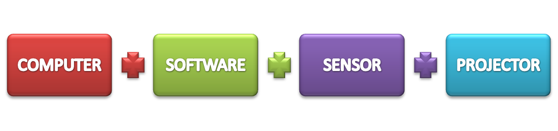 Simply install our software on your PC or Mac and connect our projector and sensor to the computer's USB and HDMI ports. We recommend using a laptop, which we also offer, for added flexibility. Our Interactive Suface Kit is touchless which means it's operated by gestures rather than by touching an interface. So once our projector and sensor are connected and powered, there are no other components needed to make the games and effects work.